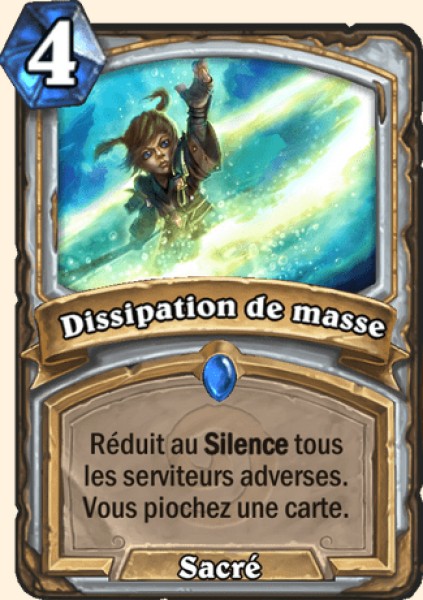 Dissipation de masse - Rang C C’est un sort quelque peu étrange. Cela dit, il est écrit “piochez une carte” ce qui le rend meilleur. Si vous pouvez vous permettre de dépenser 4 manas, la dissipation de masse ne sera pas mauvaise. Au final, il y a de meilleures cartes comme des bien pires. Retenez simplement que ce sort ne vaut pas ses 4 manas.