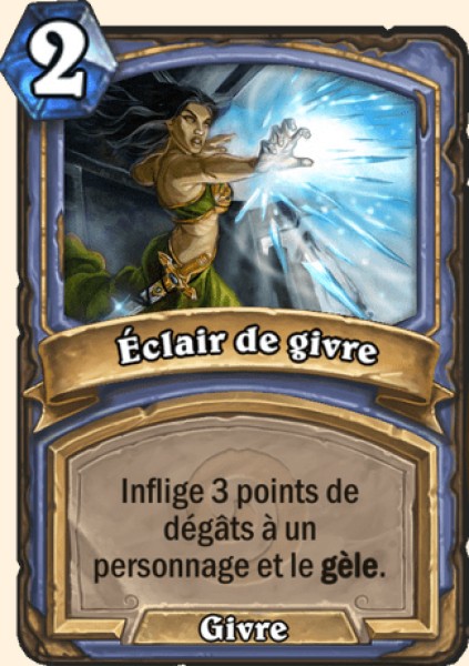 Éclair de givre - Rang A L’éclair de givre est un autre excellent removal du mage. Tout comme la boule de feu, c’est un sort utile quelque soit la situation ou le moment. En early, il permettra de retirer un peu de pression adverse. Du mid au late game, combiné au pouvoir héros, il permettra d’infliger 4 points de dégâts.