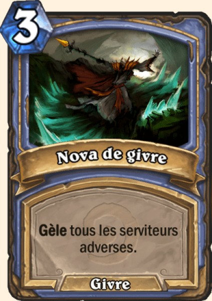 Nova de givre - Rang E La nova vous fera gagner du temps mais ne vous permettra pas de rattraper votre retard. Dans les decks construit elle sera principalement joué pour le contrôle combiné avec une Auspice funeste. Vous ne rentabiliserez jamais cette carte en arène et ça sera toujours une carte jouée pour rien.