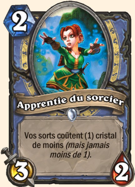 Apprentie du sorcier - Rang B L’apprentie du sorcier est exactement le serviteur qu’un mage souhaite avoir dans sons deck : prendre le contrôle du board et utiliser de puissants sorts. Une 3/2 pour 2 manas est toujours bien surtout quand elle possède un avantage comme celui de l’apprentie.