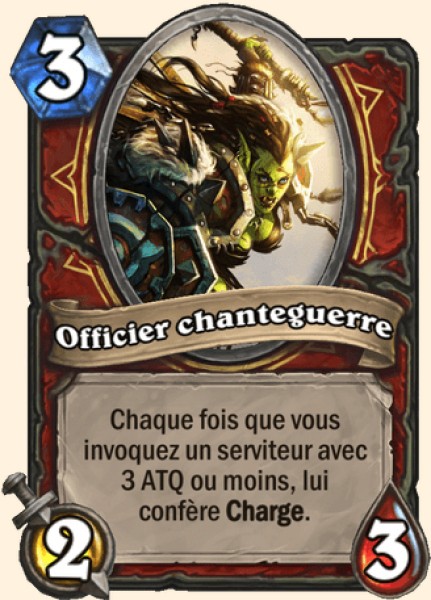 Officier chanteguerre - Rang C L’officier chanteguerre est décevante seule, mais elle aidera les autres cartes dans votre deck. La plupart des serviteurs étant en bas de la courbe de mana, L’officier sera potentiellement capable de donner la charge, et donc de garder le contrôle du board.