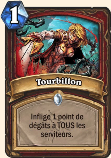 Tourbillon - Rang D Le tourbillon a le potentiel d’activer les accès de rage. Alors que ce sort est courant dans les decks construits, il est beaucoup moins fiable en arène où vous devrez choisir vos cartes sans connaître les suivantes. Les pouvoirs du mage, du voleur et du druide découragent déjà assez les serviteurs à 1 HP