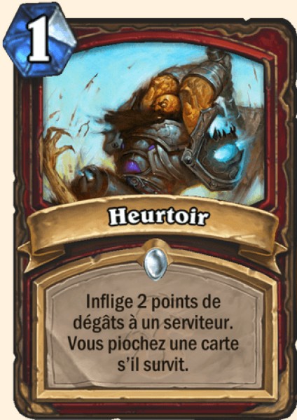 Heurtoir - Rang A Le heurtoir a 2 modes d’utilisation : les 2 sont très bons. Ce sort peut être utilisé comme un removal contre une X/2 ou une carte endommagée. Au cours du jeu, le heurtoir devient un Kriss plus puissant. En late game, cette carte est plus utile, cas si vous vous retrouvez dans une situation de top deck, vous serez capable d’utiliser le heurtoir et de jouer la carte que vous piocherez sur le même tour.