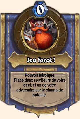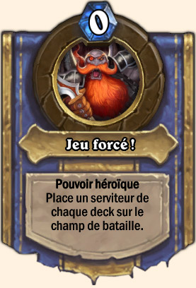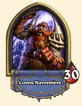 Coren Navrebière utilise son Pouvoir héroïque Jeu Forcé à chaque début de tour. Pour rappel, ce dernier invoque un serviteur aléatoire de chaque deck sur le terrain (cela ne déclenche pas les cris de guerre). En mode héroïque, Jeu Forcé invoque deux serviteurs du deck de Coren et un du votre. Comme vous pouvez vous en douter, le deck de Coren est essentiellement composé de puissantes créatures et de légendaires.