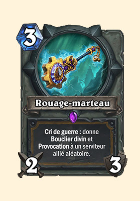 Voici donc Rouage-marteau, une arme dont vous vous équiperez et qui vous permettra de donner à un serviteur allié aléatoire un Bouclier divin ainsi qu'une Provocation. Le cri de guerre de cette carte ne fait pas les choses à moitié ! Il s'agit d'une arme de qualité épique et qui vous coûtera 3 cristaux de mana.